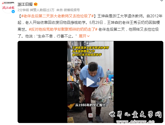 王坤森是浙江大学退休教师。自2012年起,老人开始依靠回收废旧物品挣钱助学。5月29日,王坤森的老伴王秀云奶奶因脑梗离世。老伴走后第二天,他照样又去捡垃圾了。他说:“生命不息,行善不止。”