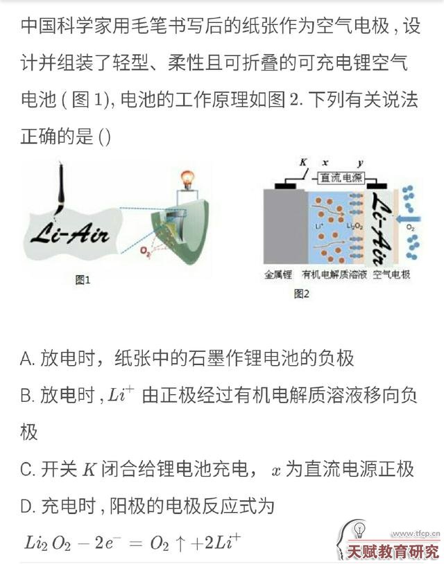命题意图:柔性电子技术有可能带来一场电子技术革命。目前柔性储能器件相对较低的理论能量密度限制其在柔性电子产品中的进一步应用,该研究成果为具有超高能量密度的锂空气电池应用于柔性电子器件提供了可能性。该题力图体现“能对与化学有关的社会热点问题做出正确的价值判断”的核心素养要求。