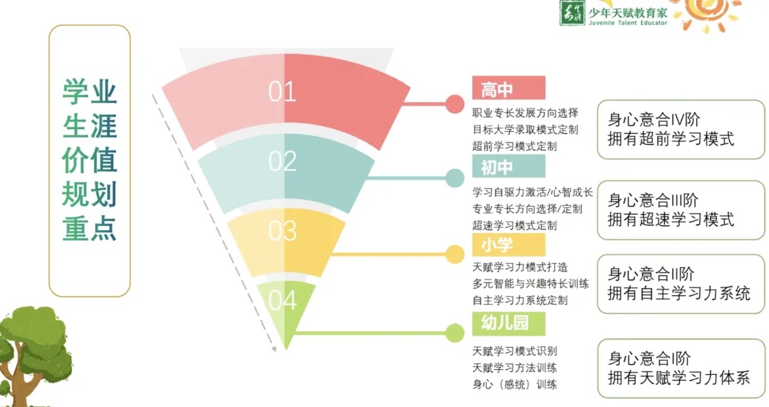 帮助孩子更早的了解,最适合什么样的学习管道,记忆模式,学科优势,怎样学可以拿到更好的结果,这一切不需要跟别人完全一样的方式,而是用孩子喜欢或擅长的方式就可以做到。少走父母这一辈的弯路,走出属于他们天赋应该拥有的独特的道路。